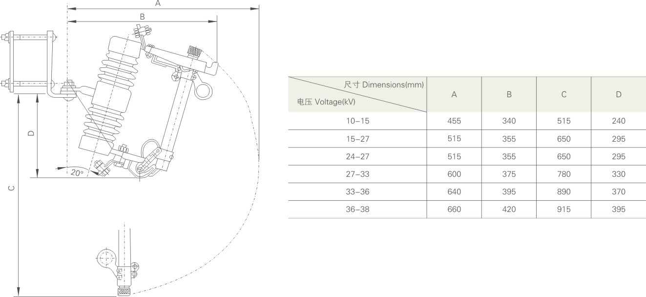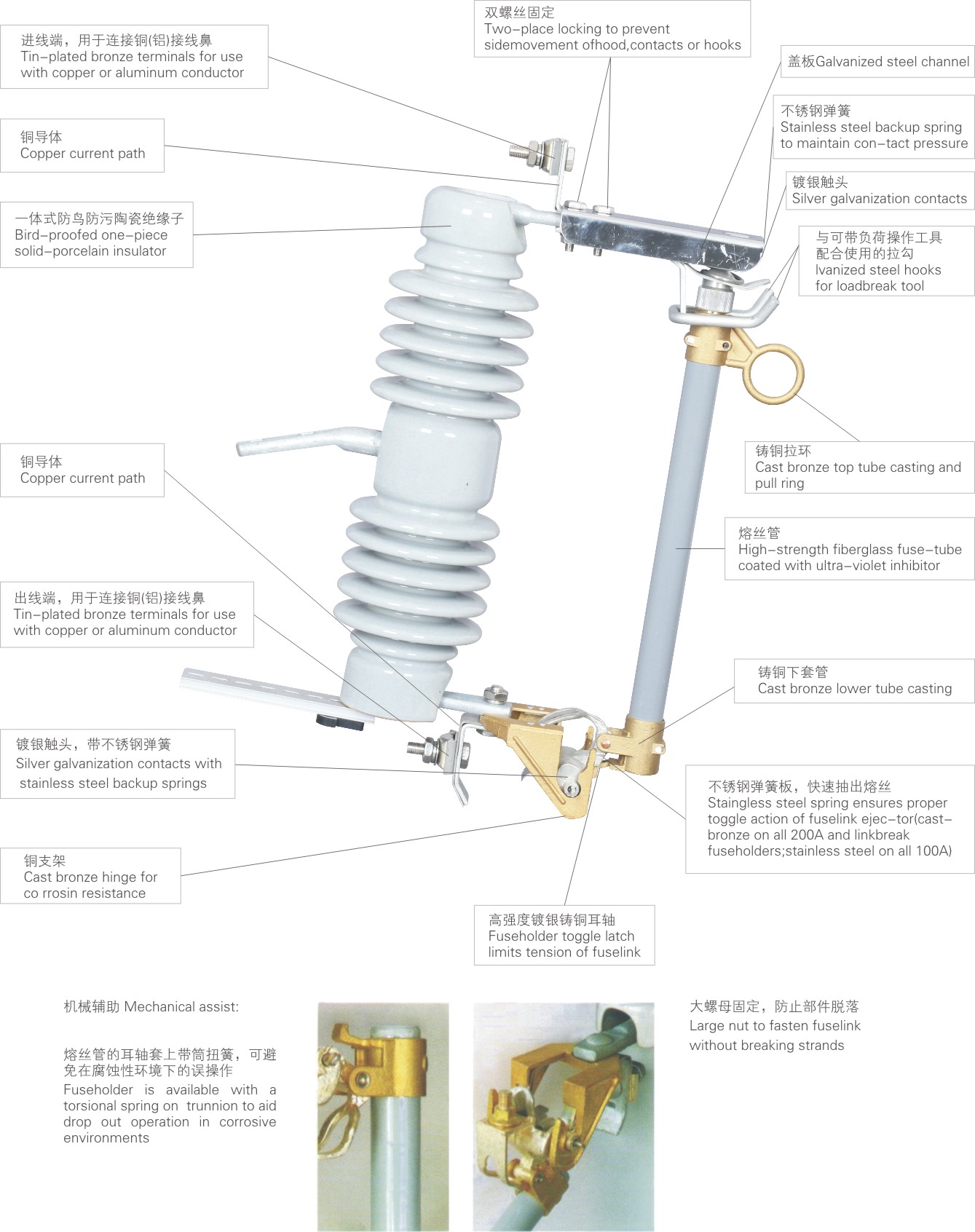 (H)RW12-12(F)戶外高壓交流跌落式熔斷器(以下簡稱“熔斷器”),適用于額定頻率50Hz、額定電壓10kV的戶外架空配電系統中,作為電力系統發生過 載或短路故障時電路或電氣設備的保護元件。熔斷器正常運行時串聯在電力線路中,熔絲處于拉緊狀態,活動關節被鎖緊。當線路發生故障時,故障電流使 熔絲熔斷,活動關節被釋放,熔管迅速跌落,將電路切斷,對線路和設備的維護起到安全保護作用。負荷型熔斷器在普通型的基礎上增加彈性觸頭及滅弧 罩,用于分合電力系統中的負荷電流。 熔斷器符合GB/T 15166.3-2008《高壓交流熔斷器第3部分:噴射熔斷器》、DL/T 640-1997《戶外交流高壓跌落式熔斷器及熔斷件訂貨技術條件》等技 術標準。